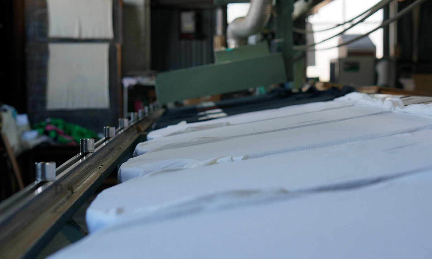 - 一貫生産 オリジナル生地製造から納品までの一貫生産(社内製造加工設備有り)